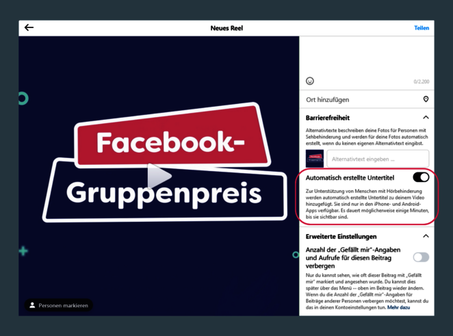 Auf Instagram könnt ihr beim Hochladen eines Reels unter “Barrierefreiheit” die automatisch erstellten Untertitel aktivieren. Nutzer*innen, die die automatischen Untertitel sehen möchten, müssen das wiederum in ihrem Profil aktiviert haben (“Einstellungen und Privatsphäre > Bedienhilfen > Untertitel).